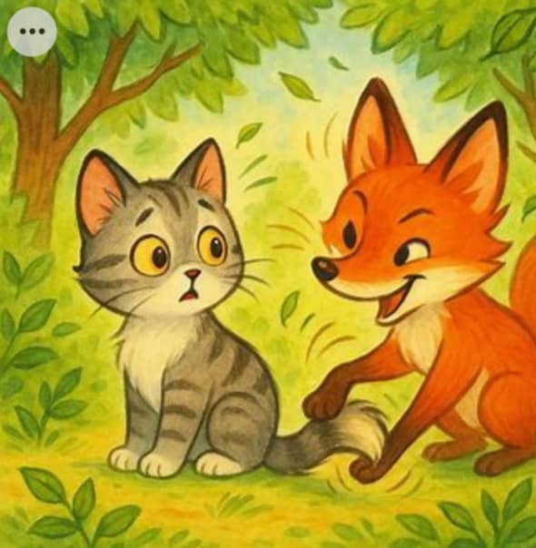 گربه ای کوچک کنار جنگل زندگی می‌کرد. روزی روباهی بازیگوش دم گربه را گرفت و او را هول داد، نه برای اذیت کردن، بلکه فقط برای بازی و شیطنت. گربه اول فکر کرد: «شاید باید جوابش را بدهم!»
