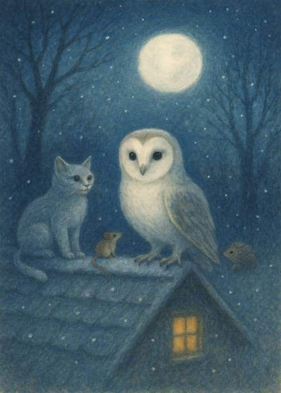 Mina looked at the white owl in silence. Kafteki, too, watched Mina quietly.