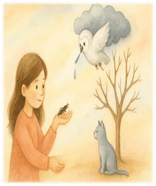 With the cat’s help, Mina found some bugs and fed them to the bird. Gradually, the swift opened its eyes, flapped its wings, and chirped softly.